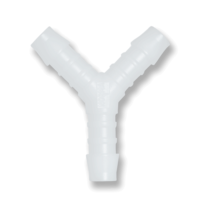 The YA Series are multi-barbed wye connectors and are made of Acetal. There is a 90° span between the top two legs of this wye connector. Available barb sizes are 1/8 inch, 5/32 inch, 3/16 inch, 1/4 inch, 5/16 inch, 3/8 inch, 7/16 inch, 1/2 inch, 9/16 inch, 3/4 inch, 5/32 inch by 1/4 inch, and 1/4 inch by 5/6 inch. Barb sizes can also be used for metric tubing.