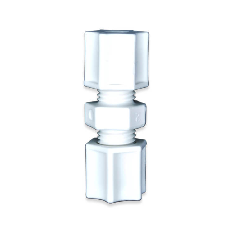 The CC Series is a straight Compression connector for tubing OD of 1/8 inch to 7/8 inch. It is available in Acetal, Nylon, Polypropylene, and PVDF with either poly grippers or ferrule nuts. It is also available in several reduced sizes.