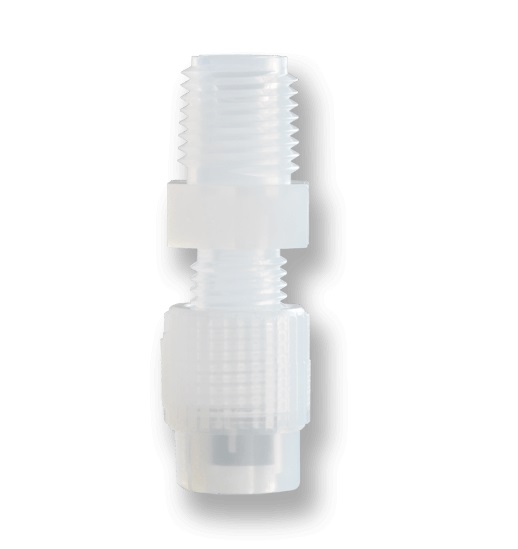 TGA Series is a PFA compression reducer connector with male NPT threads to gripper rings. OD sizes range from 1/8 inch to 3/4 inch, the thread sizes are also from 1/8 inch to 3/4 inch.