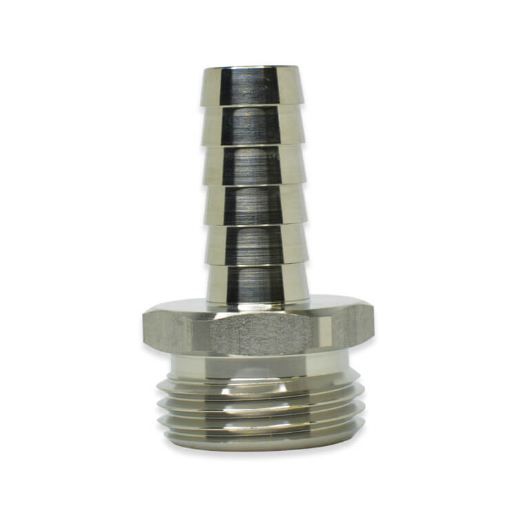 Male garden hose by Barb. Barb sizes available 3/16", 3/8", 1/2", 5/8", and 3/4". Machined of 316 Stainless Steel.