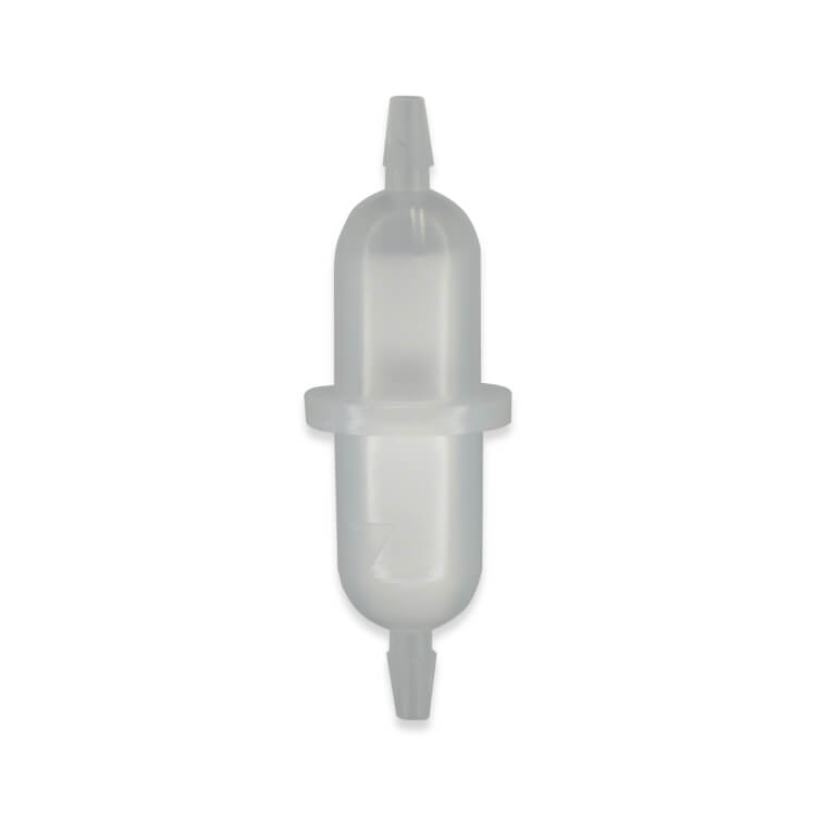 The FV series single barbed inline filter is used for compressed air or vacuum. These units have a polypropylene housing with a porous polyethylene filter. They can be used to protect vacuum pump switches and valves from contamination. Also, units are available with a 1/8 inch barb or with a male luer fitting on each end, measuring 2.4 inches in length and 0.75 inch in diameter. Filters are available with 10 or 25-micron filters. In addition, the recommended working pressure is 65 psi.