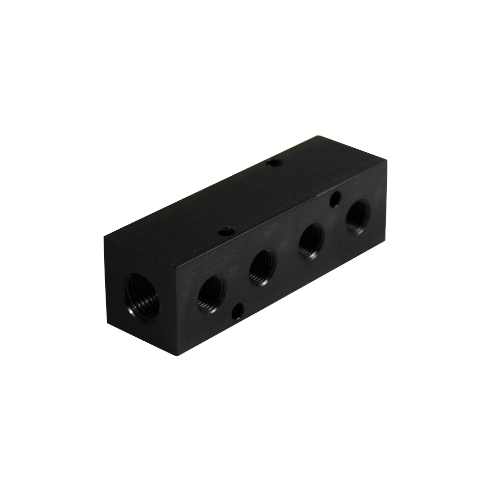 The PMM Series is a Black Anodized Aluminum Manifold that has a 1/4” or 3/8” female inlet port and 2 to 10 outlet ports of female NPT threads.