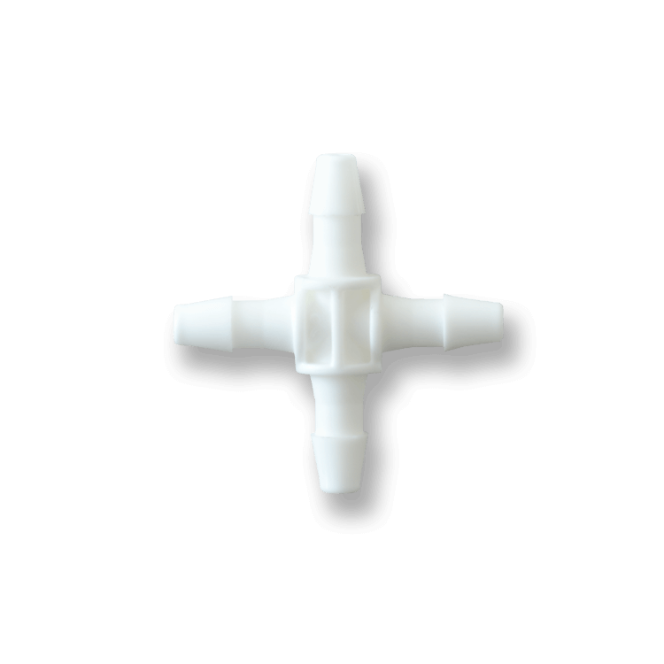 The CX series is a standard single barbed cross fitting with no molded parting line on the barb. The barb will expand the tubing to 50% above its normal size. It is available in white nylon and natural polypropylene. The available equal barb sizes are 1/16 inch, 3/32 inch, and 1/8 inch. This cross-fitting is recommended for medical and laboratory environments.