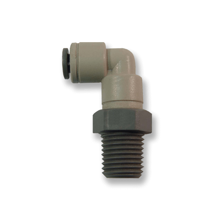 PMES Series Push-to-Connect to Male NPT Swivel Elbow connectors are available in Acetal and select sizes in Polypropylene, and Kynar®. Push-to-Connect sizes range from 5/32 inch to 1/2 inch and Threads range from 1/2 inch MNPT to 1/8 inch MNPT. Gray or White Acetal are NSF and FDA-approved and have Buna seals for air, gases, and potable water applications. White Polypropylene with EPDM seals or PVDF with FKM seals. Maximum temperature 140ºF at 60 psi for Polypropylene. For non-swivel elbows see PME Series.