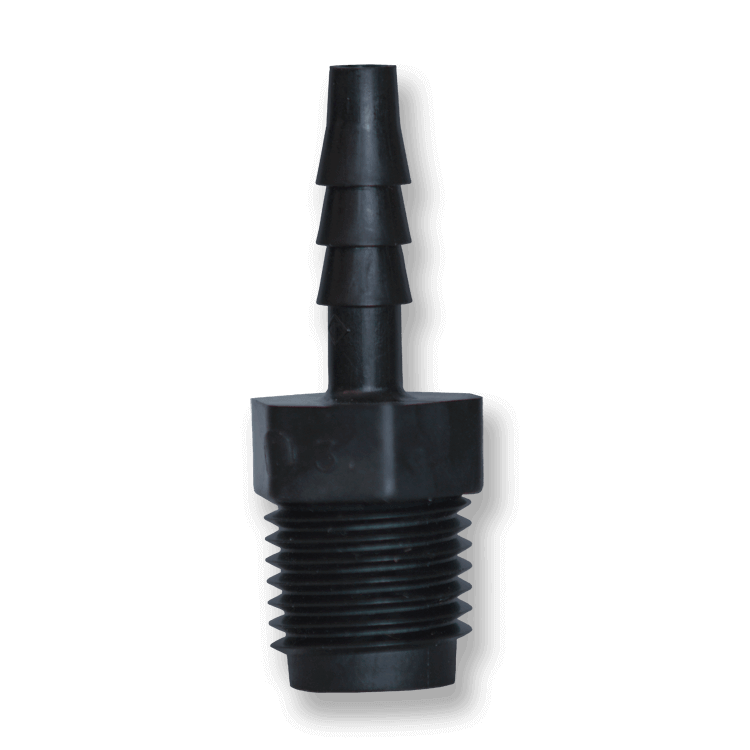 AM series is an MNPT with a triple-barbed adapter. It is molded of NSF listed natural nylon or NSF listed black polyethylene. Optional materials are: Black nylon, PVC, FDA listed natural polypropylene, and FDA listed black polypropylene. The MNPT thread sizes available are 1/8 inch, 1/4 inch, 3/8 inch, 1/2 inch, 3/4 inch, 1 inch, 1-1/4 inch, 1-1/2 inch, and 2 inches. The barb sizes are 3/16 inch, 1/4 inch, 5/16 inch, 3/8 inch, 5/32 inch, 1 inch, 1-1/4 inch, and 1-1/2 inch. Barbed fittings over one inch are not offered in polyethylene. The temperature range is -40 ºF to 200 ºF and the maximum working pressure is 125 psi.