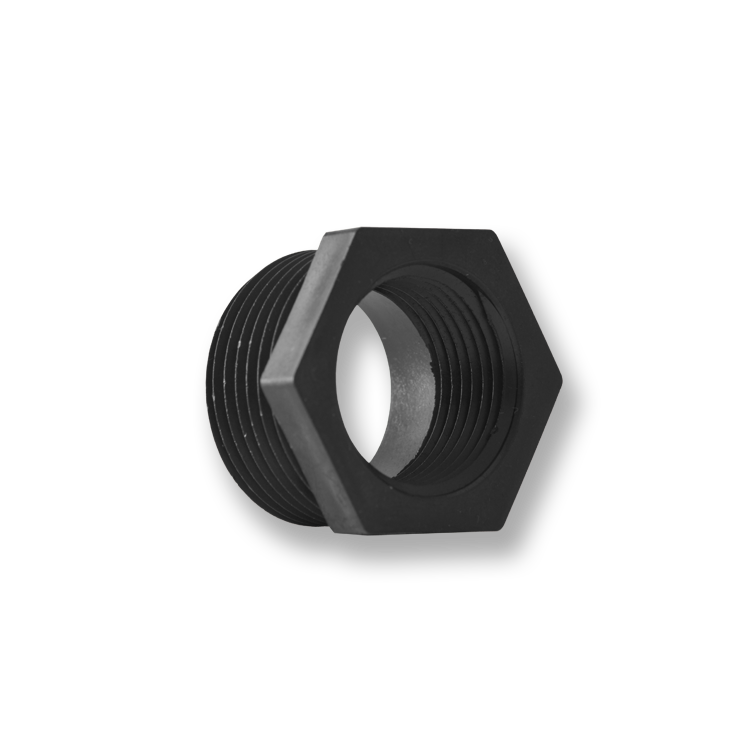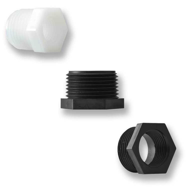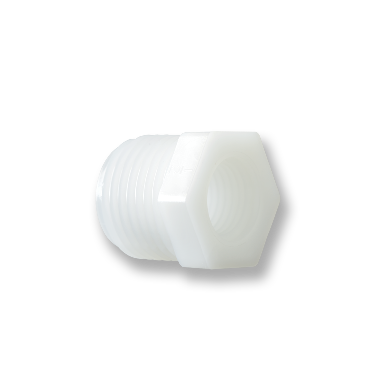 The RB Series are standard pipe Reducer Bushings. They are made of Natural Nylon, Natural and Black Polypropylene, PVDF, PTFE, and PVC. Available in combinations of sizes from 1/8 inch to 3 inches in UNF and NPT male and female threads.